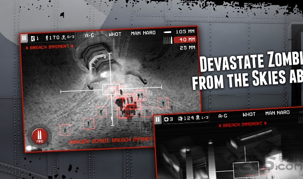 2、在空中使用机关枪、导弹等多种武器来扫荡地面上的僵尸!