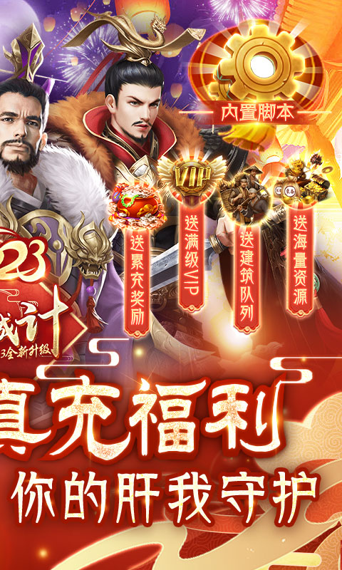 上线送V5、100万铜币、58888元宝、10万粮草,万充活动等级达到送累计万元以上真实充值卡,每次主公升级都可领取大量元宝,七日登录送大量元宝、累计签到送大量元宝,每日活跃任务送大量元宝和10元真实充值卡