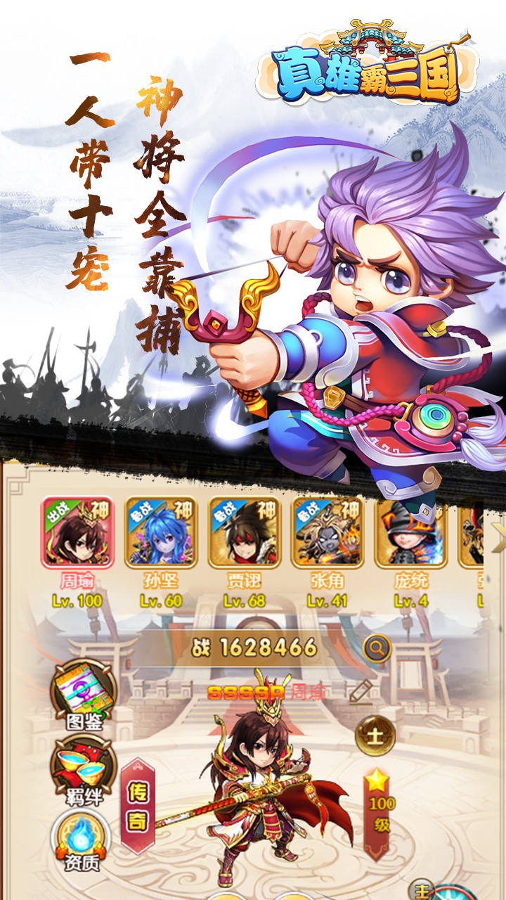 《真雄霸三国》是一款以三国时期为背景的Q版卡牌新作,24小时轻松离线挂机,运筹帷幄之中,决胜千里之外!。 游戏还原三国历史画卷,拥有独树一帜的“冲锋式”战斗模式, 告别传统策略类回合制出手的战斗套路,让战场更加真实!上百种武将各具特点,激萌个性,炫丽技能,让战场更加多变! 游戏更加入了强大的灵宠,为主公守护,全新的挂机玩法,还有更多轻松、有趣、比拼RP的玩法等着你来探索。