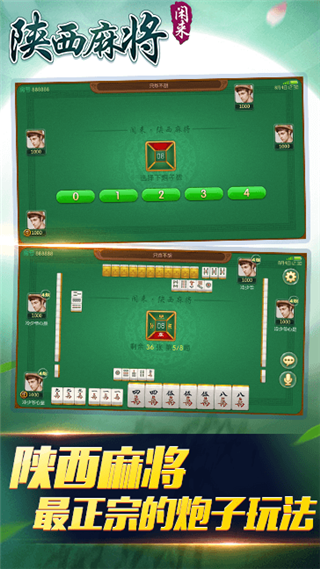 闲来陕西麻将最新版是一款在国内部分省份和地区颇有名气的闲来系列在线打麻将游戏之一的陕西麻将手机版,以陕西地区的麻将玩法为主打,还特意加入了在线真人对战和房间号的模式让玩家们可以在线对战哦!游戏内提供虚拟计分的方式来让玩家们统计输赢,玩家只需要通过闲来陕西麻将开设自己的专属房间人后拉大家一起进来玩就可以了!其时尚简约的细腻画面,长时间玩也不会感到审美疲劳!闲来陕西麻将安卓版作为一款四个人才能玩的游戏,玩法简单、爽快,计算方便,下炮子等特色玩法让游戏更加激烈刺激。