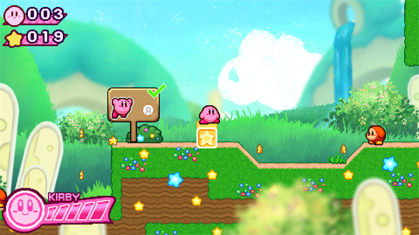 星之卡比银河故事手游以2D横版卷轴过关为主要玩法,你将化身粉嘟嘟的卡比,控制角色跳跃、搜集各种星星和宝石,使用卡比的熟悉动作,吸入,吐出,飞翔,复制,在有立体纵深的关卡中自由地来回探索冒险。其呆萌可爱的卡比形象,五彩缤纷的卡通世界,还有富有变化和有趣的场景设计为玩家带来全新的冒险体验。