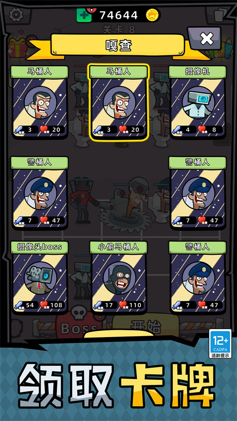 合并大师手游中具有许多的角色,比如摄像员、摄像机、摄像头boss、马桶人、警桶人、小偷马桶人等,这些都是通过摄像机和马桶人慢慢合成所得的。合并大师手游内还具有许多的卡片,其中包含了呼叫出租车来连续攻击敌人、冻结随机敌人、攻击所有敌人5秒、射杀纵对中的敌人等等,这些卡片需要玩家闯过一定的关卡才能进行解锁。有兴趣的玩家不妨来下载游戏体验吧!