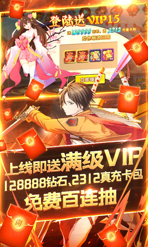 1. 上线即送满级VIP、128888钻石、2312真充卡包,免费百连抽;