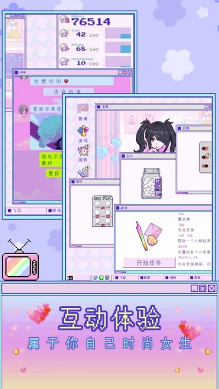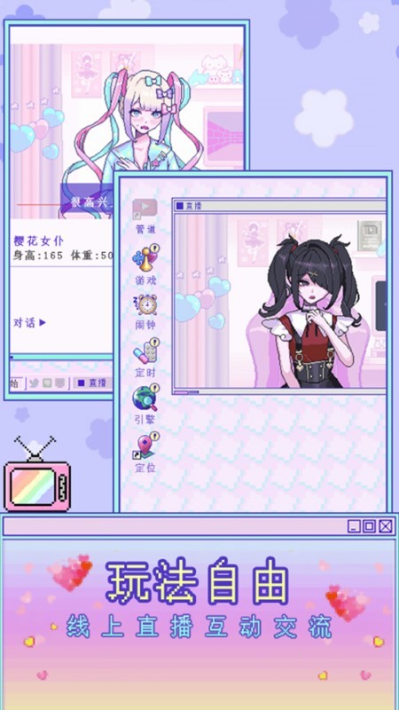 你需要自己去养成自己心目中的电子女友主播,这位可爱的主播主有着很强烈的想要被他人认可的欲望,你需要帮助她进行日常直播,照看有时病娇的她,喂她吃药,并同时努力增加她的粉丝数量。游戏玩法自由度超级高,在游戏中玩家可按照自己的想法和女孩互动,不断地增强好感度,解锁更多功能和更多的结局吧。