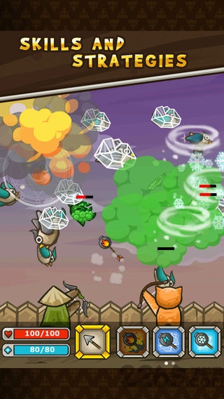游戏中的猫是个神射手,需要在和鸟的战斗中获胜,保卫自己的家园。游戏中要控制小猫射击空中的鸟儿,只要点击技能,再点击天上飞过的鸟儿就会自动射出,看似简单,实际玩起来就会发现游戏内容可一点都不简单