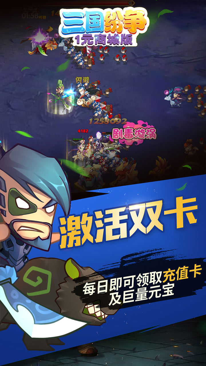 《三国纷争(1元商城版)》是一款卡牌收集类游戏,游戏美术风格Q萌。升级即送百连抽,吕布,诸葛亮等神将随你抽,游戏将瑞兽元素融入到三国题材中,加上颠覆性无节操剧情,给玩家带来与众不同的体验。游戏中独创骑战玩法进一步加大了战场的不确定性。众多著名武一一登场,更融入大量瑞兽元素,让每个武将都能骑乘驯服的瑞兽一同作战,让玩家在瑞兽的帮助下体验微型战争的乐趣。