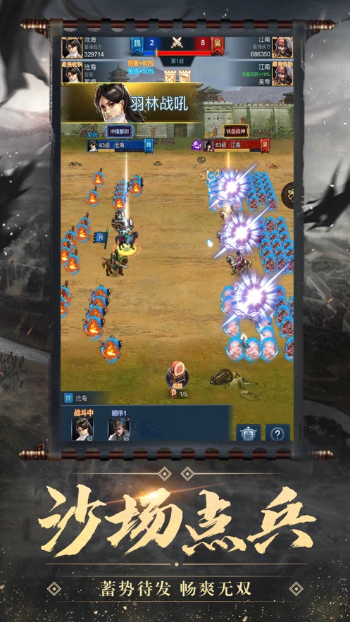 体验宏伟浩大3D真实水墨场景,需要观察敌军的阵容组合,利用兵种相克,将领组合的原理才能以弱胜强。