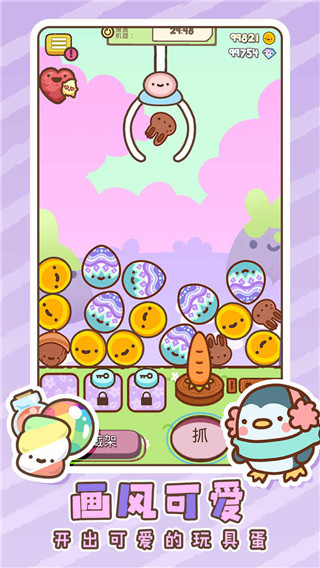 萌宠娃娃机游戏是一款非常有趣的抓娃娃小游戏,卡通温馨的画风,可爱Q萌的宠物,经典的抓取玩法充满童年回忆,诸多元素给玩家带来一场全新的抓娃娃体验。在游戏中你将通过抓娃娃机抓上来各种不同的彩蛋,每个彩蛋需要一定的时间或者使用金币来直接打开获得收藏品,很多可爱的萌宠可以让你来抓取,不同的关卡里的萌宠种类都不一样。还有非常多的神秘地图等你来挑战,每一种地图里可以抓取的宠物都是不同的,此外,游戏中还有许多惊喜彩蛋将等你来发现,多种有趣的内容会给你不同的体验。值得一提的是,萌宠娃娃机最新版游戏玩法简单,不需要复杂的操作,玩家只需要在屏幕上点点点即可,非常有趣,老少皆宜,绝对是一款闲暇之余玩游戏的不二之选,感兴趣的小伙伴快来下载体验吧。