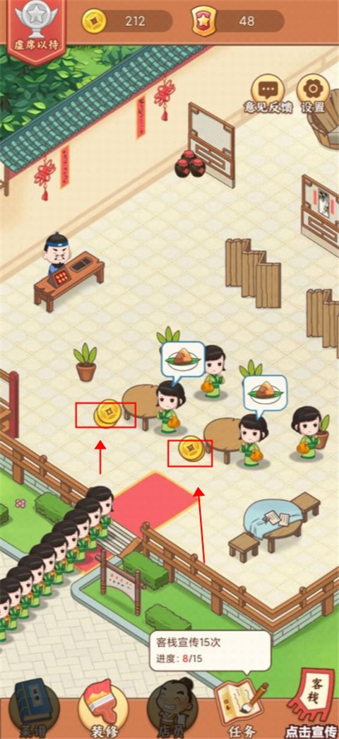 2、放置挂机轻松经营获得超多福利,赚取金币解锁全新装饰,创意组合打造个性客栈