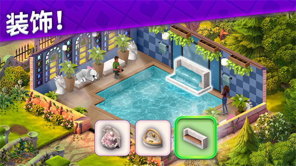 8、解决令人轻松愉悦的三峰纸牌谜题,展示你那令人惊叹的装修技艺,改造庄园的花园、大厅、卧室、书房以及更多场景!成千上万种设计选项和风格让你随心所欲地搭配出你心目中的梦想庄园!