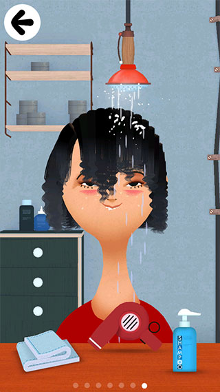 4、左右滑动还可以切换不同的场景,例如可以带顾客洗头,点击拖动花洒即可喷水洗头,依次进行使用洗发露、毛巾以及吹风机。