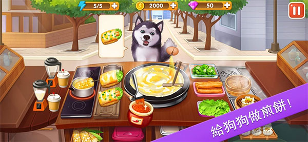 4、图中那只如吉祥物一般的哈士奇,它不仅是小店的第一位“客人”,还是能够听懂人语的神奇狗子,这里我们需要为它做一份煎饼;