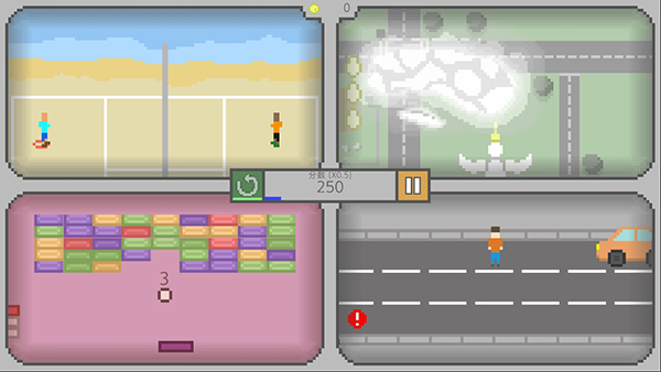同屏四玩手机版是一款简约轻松的烧脑闯关街机类游戏。游戏有着简洁轻松的画面风格,玩家可以自由选择想玩的游戏,控制四个分屏页面的游戏角色,需要玩家快速做出反应,让四个屏幕上的任务都能顺利完成。一次玩四个游戏的游戏?听起来是不是很不可思议,在这款游戏中,你将同时玩四款街机游戏,当你在其中一个游戏死了,游戏就结束了。游戏内置了30款不同的小游戏,每一款游戏,如果单独玩,都是特别简单的,然而游戏中你需要分心去同时玩四款小游戏。你的大脑不仅要同时处理四款游戏中正在发生的事情,随着游戏的进行,游戏会随机切换,速度会逐渐变快,于是使游戏的难度直线上升,快来接受挑战吧,感兴趣的小伙伴赶快来下载体验吧。