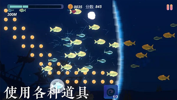 3、通过点按屏幕控制小鱼上下游动来避免碰撞,同时还可以收集道具和金币来增加分数和能力。