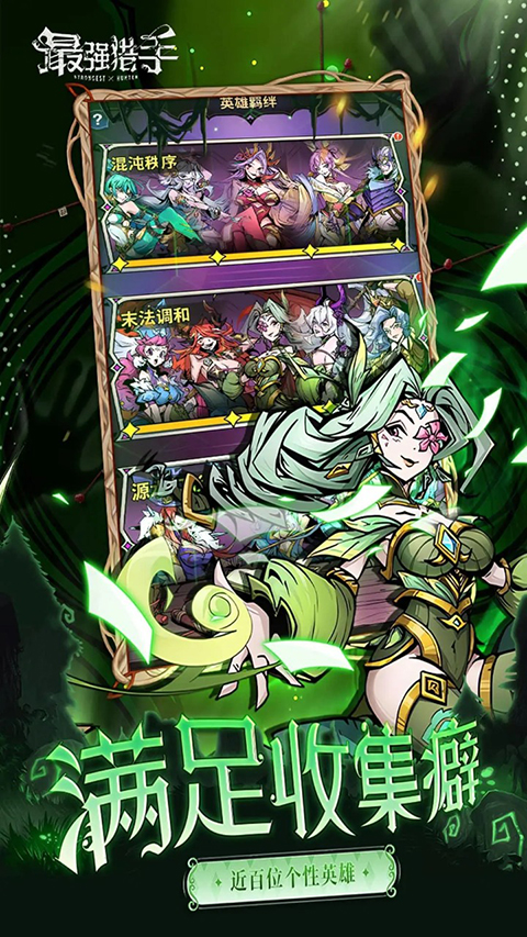 最强猎手是一款策略放置类冒险游戏,采用暗黑系美术画风,Q版二次元人物形象将英雄角色进行打造,每位英雄都有独特的属性和技能,玩家可以自由培养,自由搭配,组合出强大的英雄队伍,开启神秘大陆的冒险之旅。