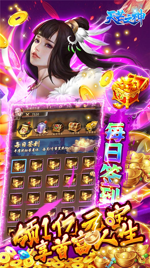 天芒之神0.05折手游是一款以三国为题材的放置挂机游戏,内置0.05折游戏福利,1分钱直接解锁三国全武将,完全无门槛免费送装备、材料、资源、经验(主角)等,直接毕业点击就有,每天签到送1亿元宝,挑战30天花光30亿,至强装备等你来拿!