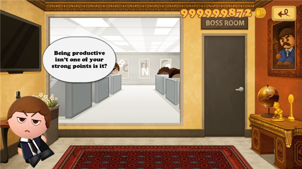 5、除了用东西打,还可以拖着老板满屋子扔,摁着脑袋往墙上撞,每打一下老板,都会得到金币,打死了会得到更多金币(这个设定太神奇)。老板死一会之后还会复活,然后换种方式接着打!