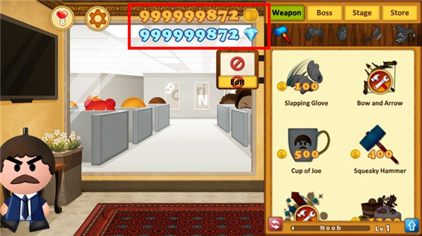 2、玩法很简单!选择想用的工具,对着老板往死里扔,往死里打!游戏的玩法提示很充足,可选的工具很多,抖S们兴奋吧!