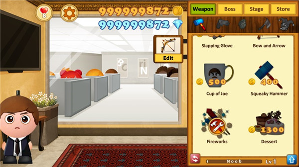 作为时下最夯的发泄游戏,boss3游戏一经推出就受到玩家热烈追捧,可谓被老板虐得死去活来的苦逼上班族手机必备游戏。游戏提供了多种武器作让玩家选择,既有正规意义上的兵器,如弓箭、钉枪等,还将咖啡机、烟花、签字笔、恶臭的食物、牙签等日常用品纳入了武器的行列,同时还体贴地设置了编辑环节,让你自由设计这些武器。真是对同志有着春天般的温暖,对老板有着冬天般的残酷。在游戏中,面对大饼脸老板,咱们再不是那个唯命是从的可怜鬼了,可以通过各种危险性武器对老板展开狂暴的复仇。除此之外,游戏画面精美,十个不同主题地图、30个关卡供你解锁挑战,还拥有上百款冷兵器、热武器等多种武器供你挑选,高度随心的虐待过程,惨不忍睹的画面呈现,辅以轻度休闲有趣的暴走玩法,让你玩起来真是哭笑不得,十分的有趣好玩。