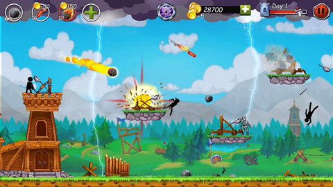 火柴人之守卫城堡2是一款策略塔防类游戏,主角是我们熟悉的火柴人,游戏画面制作的非常不错,玩法简单,上手轻松,对于喜欢玩此类受的玩家们而言,这款游戏一定能够为玩家们带来不一样的体验。游戏中玩家的任务就是保护自己脚下的防御塔不被摧毁,游戏操作简单轻松易上手,轻轻滑动屏幕就可以调整投石机的投射角度,注意瞄准,去攻击其他平台上的火柴人,将对方的防御砸毁,击败一个个的敌人。另外,玩家还可以借助城堡塔尖上的弹射器来守卫自己的城堡免遭其他火柴人势力的破坏,在这期间也会有大量里的新式武器装备以及其他类型的防御工事,可供玩家解锁使用,针对不同的新式武器,你还能对其进行升级、强化,能够让你在双方对战过程中,战斗的更加持久,输出更高。除此之外,游戏除了经典的无限模式,还增加了60级的战斗等级,游戏中玩家现在不仅要面对弹射器上的追随者,还要面对火炮、攻城塔、攻城公羊和巨大的步行战斗机构,这些敌人拥有强大的武器,可以一拳摧毁你的城堡。