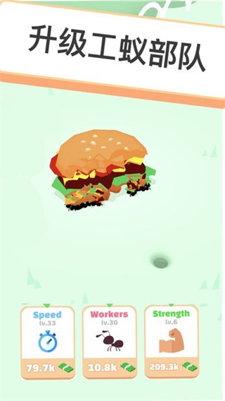 1、你能指引不断发展的蚁群,让他们吞噬大量的小虫子、热狗香肠乃至飞机场;2、给你的蚂蚁大军吞噬你眼前的一切,进而给你获得一枚能够应用的奖赏金币;