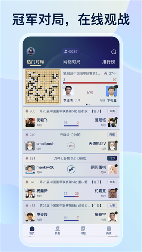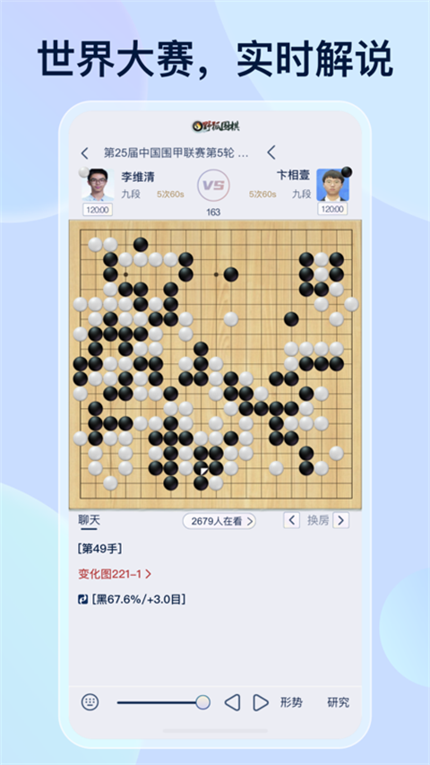 围观大赛直播、与职业解说互动,获取时时的比赛新闻和棋手资讯。