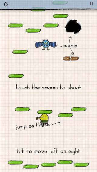1、在游戏中玩家要让涂鸦弹簧小怪物不停地往上跳跃,在跳跃中要小心破碎的平台、移动的蓝色平台、黑洞、不明飞行物和坏人,途中有快速上升的火箭、竹蜻蜓、弹簧和弹簧鞋,宇宙版本有大火箭。2、游戏中一共有多种颜色的平台,就普通版本而言:绿色的平台是固定不变的;褐色的踩到会断裂;蓝色的平台是会左右移动的;白色的是踩一下就会消失;黄色的是有时间限制的,会变成橙色、红色,直到断裂消失。在普通版本里还有可以上下移动的灰色平台,跳上去会左右移动一次的暗黄色平台,跳上去会消失但会在上方出现的闪烁的白色平台。在绿色或蓝色的平台上还会有弹簧或蹦床等,玩家们可以帮助小怪物跳得更高。但是借用弹簧等跳跃,由于速度变快,使得玩家无法对上方的突发状况做出及时的反应。