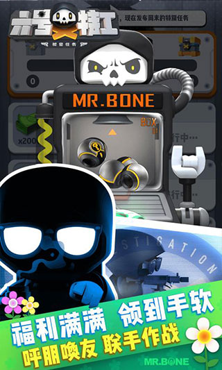 畅快射击只需轻轻一点,策略搭配全在一念之间!《六号特工:秘密任务》是由酷帅有范、好玩有梗的MR.BONE正版授权的休闲手游。在这个满是脏丝的世界,有着丰富的场景、爽快的战斗、酷炫的武器和个性十足的角色,谁会成为最强特工呢?小编就是在公踪号布克金刚上面找到六号特工,包括新手礼包,等级礼包,节日礼包,特权礼包等都可以领取,领完感觉可以进入游戏了!除了这些礼包之外,还可以找到折扣福利,专属客服,礼包都可以大大增加玩家的战斗力,不用看攻略都不会卡关。领到福利的小伙伴们快快进入游戏一起战斗吧!作为新世界联合政府旗下的特工机构,脏丝调查局ZIB拥有着全球最先进的科研团队,同时也拥有着整个世界最强力的武器装备。同时,依靠研发部最新开发的融合科技,所有的同等阶武器装备都可以相互融合,成为更高等阶的特工装备。