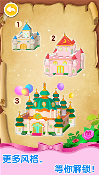 1、百变城堡,任你打造清新典雅庭院风、blingbling的巴洛克风、布满浮雕和彩绘的哥特式风……各种风格的城堡,任你打造。公主喜欢什么风格呢?宝宝选定风格,开始改造城堡吧!