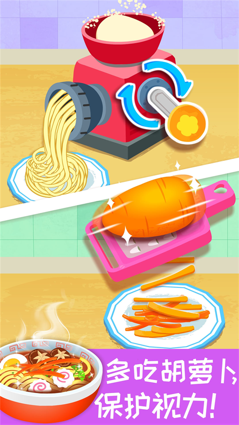 宝宝营养料理是宝宝巴士旗下的一款制作宝宝料理的儿童游戏。家长可以让宝宝在游戏内学着制作美味的料理,让宝宝了解到各种各样好吃的营养料理,比如美味的果蔬汤、营养超高的胡萝卜面等等。游戏内的每道美食料理都有着精细的教程指导,让宝宝可以轻松顺利的进行制作。也可以让家长们在宝宝营养料理内学习到如何科学搭配营养餐,帮助宝爸宝妈解决宝宝挑食等难题,让宝宝健康成长!有感兴趣的小伙伴就快到本站下载吧!