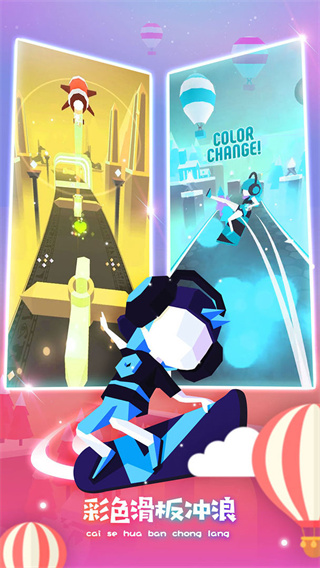 滑板色彩冲浪中文版是一款休闲跑酷类游戏,游戏整体画面设计采用了低边形的几何处理,这样不仅带给玩家更加简约的视觉亮点,同时鲜艳色彩的搭配也让该游戏的挑战变得更为动感,再加上空灵清新的BGM使得玩家在体验过程中非常放松。相信玩过滑板或看过国外滑板视频的玩家都会被其奔放自由、惊险刺激的运动效果所折服,不过滑板色彩冲浪游戏相比极限滑板运动要少了一些惊险与刺激多了一份休闲与舒适。游戏的操作非常简单,玩家只需要点击左右两边的屏幕即可控制滑板进行移动,并可以在屏幕下方冲刺按钮填充完毕后点击加速,赛道中所布置的五颜六色的立体将是是你最大的障碍,你需要跳跃过去或者躲避它们。另外,滑板色彩冲浪为了增加可玩性,还加入了颜色的融入,所有不仅有着出色视觉体验效果,待你完成撞色操作还能获取能量的高能补充,反之则会掉血。除此之外,玩家还可以对自己的角色和滑板进行升级,升级的等级越高那么防御和能量也就越高,玩家在游戏中通关也就越容易。