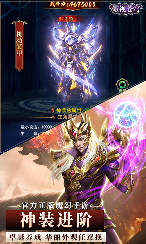 傲视苍穹手游官方版是一款超级魔幻mmorpg大作!本游戏的美术全面升级,有着超清画质高精度建模和震撼的战斗技能效果,还有上千套华美的造型和强化流光表现让装备更炫,以及精灵随战、天神附体助力玩家们实力碾压全场。