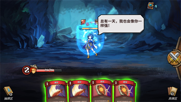 除了遇到事件以外,还会遇到怪物和BOSS的战斗,战斗中每个职业都有一定的行动力,根据不同的行动力进行卡牌利用,攻击、道具卡牌的可指向进行释放,且怪物头顶的也会为你指引其下个回合所释放的技能和对象。