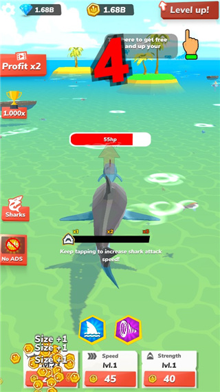 2、再次点击右上角的升级,你可以获得相应的金币;升级后甚至可以追杀比自己更大的鲨鱼;