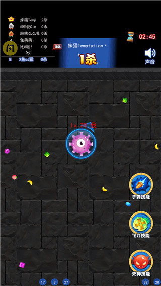 2、玩家选择吃货英雄进入游戏,通过不断吃散落在地图各处的食物,发育增长体积。可以吞噬体积比自己小的吃货,快速增长实力。