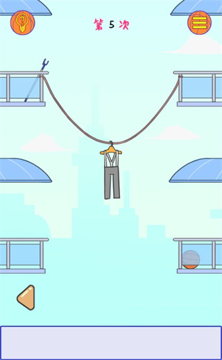 第五关:点击柜子里的鱼骨头和撑衣架,用撑衣架把衣服拿到,再用鱼骨头割断绳子荡到对面拿到篮球。