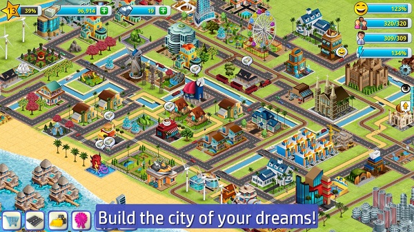 7、从100多个独特建筑(住宅,商业,农场,社区,装饰,公园,植物,海滩和海洋建筑,如石油平台等)的列表中解锁和建造