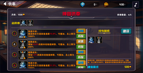 ④:供奉:可以建造各种供奉获得各种各样的加成,建造后激活即可获得加成(但是需要消耗金币)