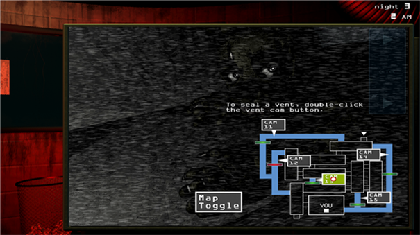 2.Freddy:在走廊出现,时间随机。发现后打开监控或维修面板即可躲过,如被其Jumpscary,通风管道故障