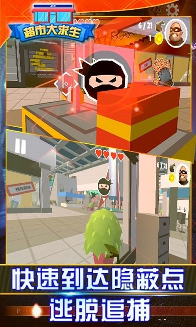 冒险的闯关游戏,玩家们可以在这个大型的地下超市随意的走动躲藏,和自己的队友提前在说好的地方埋伏好,玩家将享受这个奇妙的有趣的游戏玩法,感受精彩的游戏体验,在这个3D 的游戏画面中享受一场激烈精彩的战斗。