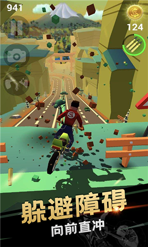 2、玩家单击屏幕以控制自行车在赛道上的平衡,然后在前进过程中避免障碍。