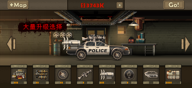2、游戏中,玩家需要在车上安装装备,例如加农炮,炸弹和火箭发射器等,来对抗不断涌来的僵尸群。