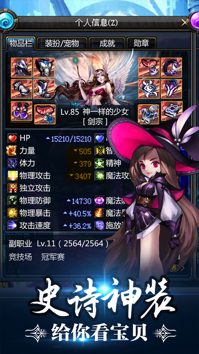 美术方面,整个游戏使用2D美术制作方式,角色使用骨骼动画完成,游戏场景使用魔幻风格。游戏中的装备炫耀多姿,从视觉上极大的满足了玩家的需求,华丽无比,并且能赋予玩家不同的基本属性,不仅好看,而且实用。此外,游戏还拥有各式各样的技能特效,极大丰富了游戏视觉效果。