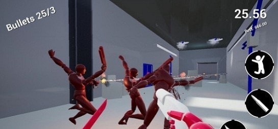 3、敌人,人数比你多,火力比你猛;而你只是孤身一人,要捡拾死去敌人的武器,去射击,去砍杀,还要穿行于低速移动的密集子弹之间,艰难前进。