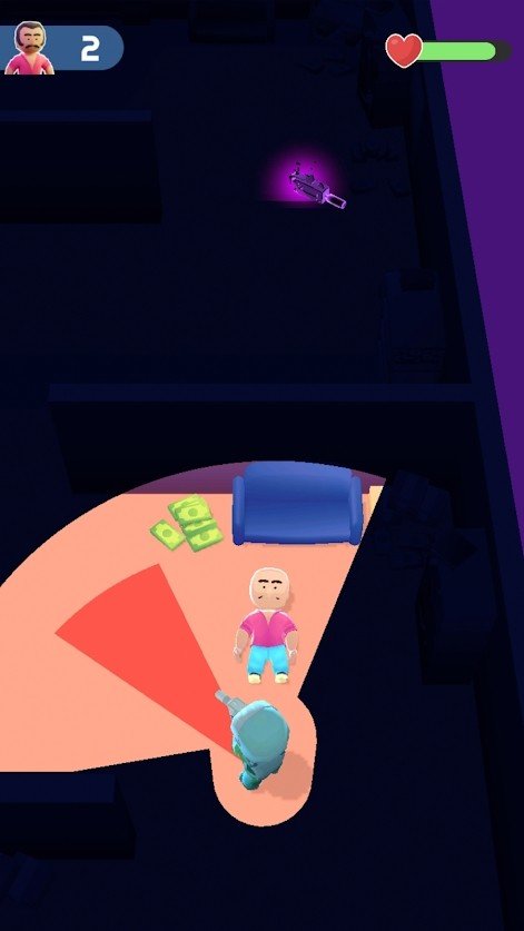 让我们开始游戏吧!与罪犯一起玩,并尝试到达毒枭家的顶层。游戏将缓解您的压力和焦虑。成为隐身高手!游戏的目标是在不被守卫发现的情况下到达最后一层。如果守卫注意到你,游戏以射击结束。射击扇区显示在角色面前的地面上。玩家还有一个手电筒半径。