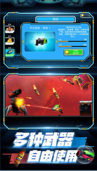 1、内容丰富,除了普通的闯关玩法,游戏中还有无限模式,挑战之塔,终极对决等等玩法任你选择。2、世界boss,消灭boss可以获取大量的武器装备和金币砖石,搭配不同机甲装备,体验刺激的对决。