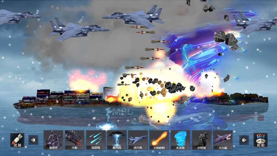 2、丰富的武器和怪物种类可供选择,拥有海怪、海神、水龙、洲际导弹等一系列超级武器;
