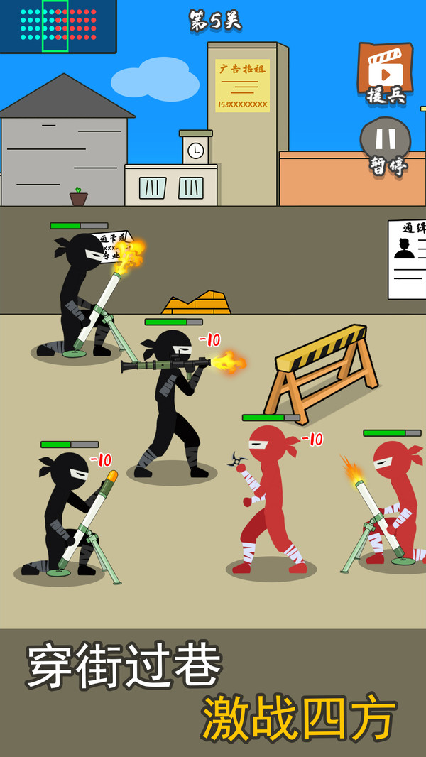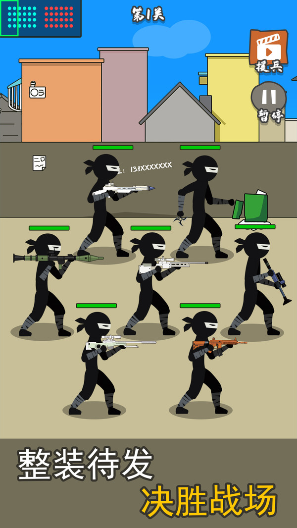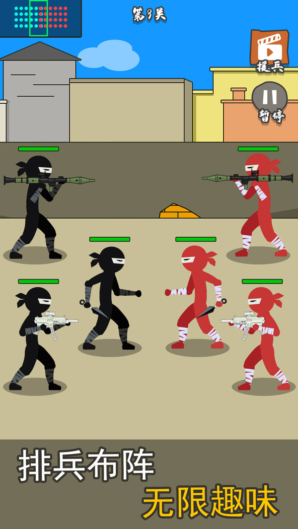 枪战对决狙击战场是一款独特的排兵对决游戏,同时各个关卡的敌人也会更加的危险,更高级的武器和士兵让战斗更加精彩,你要自己招募忍者士兵,简单无比的游戏操作,对峙敌人,不同的士兵有着不同的火力!