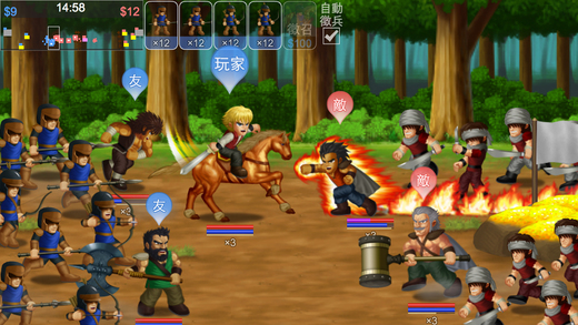 - 战争: 在战场上赚钱招兵、攻城夺营,与百人大战。