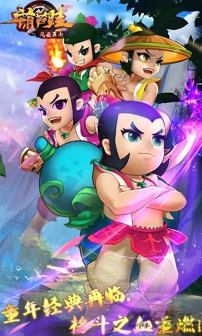 正版授权格斗手游《葫芦娃风云再起》,重装上阵,精彩无限,童年经典,完美重现!葫芦兄弟再聚首,人气角色,悉数登场。化身为力大无穷的大娃,刀枪不入的铁娃,焚烧一切的火娃,还有集各种能力一身的金刚葫芦娃,去粉碎蛇妖和金翅雕的阴谋吧!